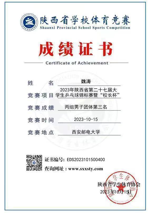 10月9日——10月13日“中国移动5G杯”陕西省第二十七大学生乒乓球锦标赛暨“校长杯”比赛在西安邮电大学长安校区体育馆顺利开赛。我院学生机制2305班魏涛作为学校参赛代表之一参加此次赛事,取得丙组男子团体第三名的优异成绩,这是我院学生在此类赛事中取得的最好成绩。